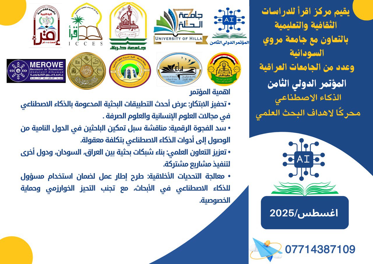 ويهدف المؤتمر إلى مناقشة أحدث التطورات في مجال الذكاء الاصطناعي وتطبيقاته في خدمة البحث العلمي، واستعراض التجارب الأكاديمية والبحثية التي تساهم في تطوير المجتمع وتحقيق التنمية المستدامة.